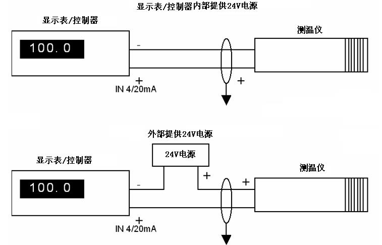 對于4~20mA的模擬信號輸出。為兩線制環路電流輸出方式,其與顯示器或控制器的連接,有以下兩種典型應用(連接法):